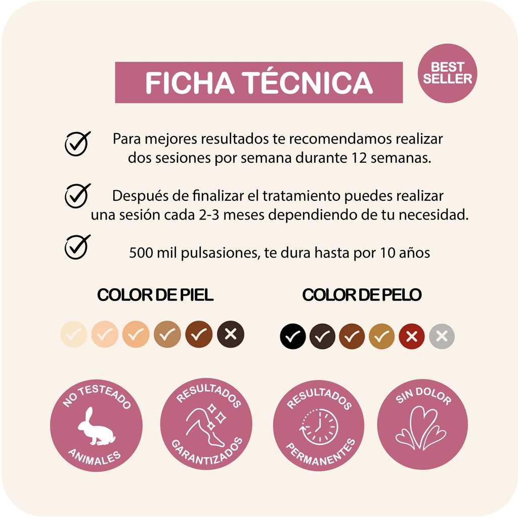 Especificaciones técnicas: Láser de diodo 810nm, 500,000 pulsos garantizados, batería recargable de 60 min